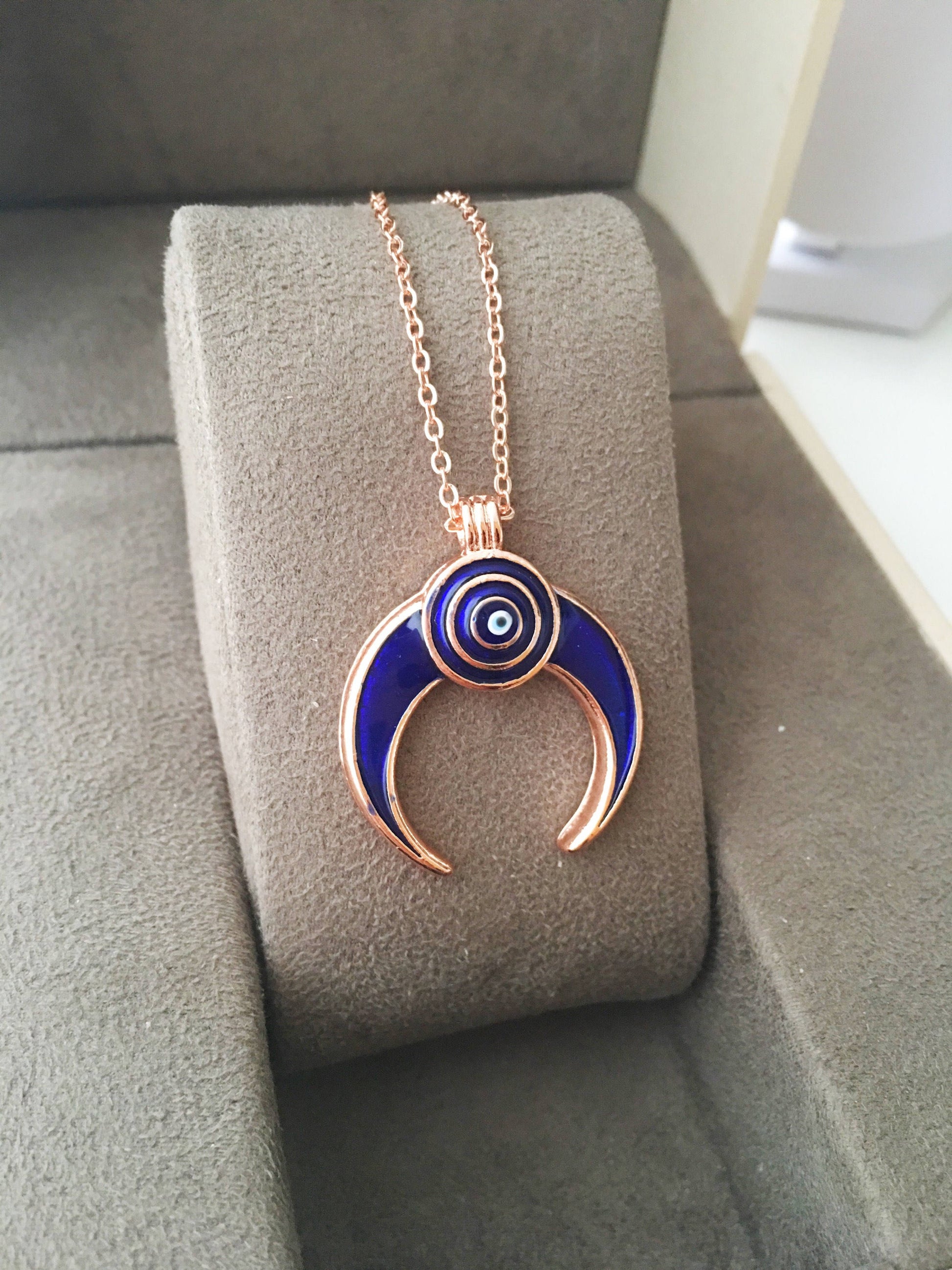 Double horn necklace, evil eye necklace, crescent moon necklace, evil eye horn necklace, evil eye moon necklace, blue evil eye necklacr